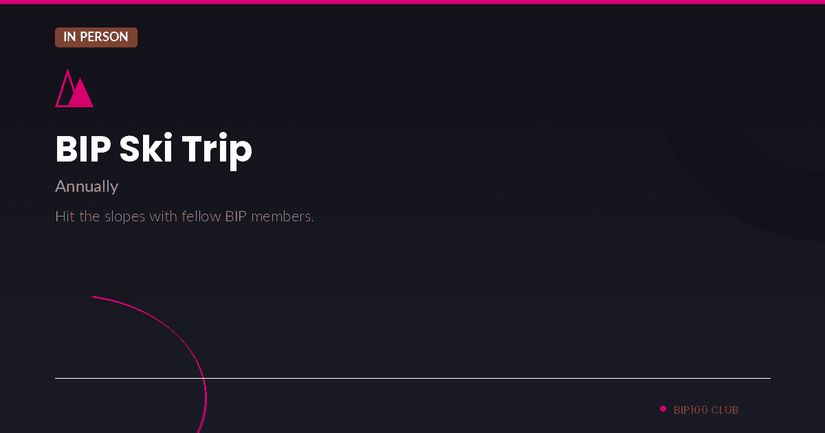 Our annual ski trip brings BIP members together for an unforgettable few days on the slopes. A perfect blend of adventure, relaxation, and quality time to strengthen relationships outside the usual business setting. Open to all abilities.
