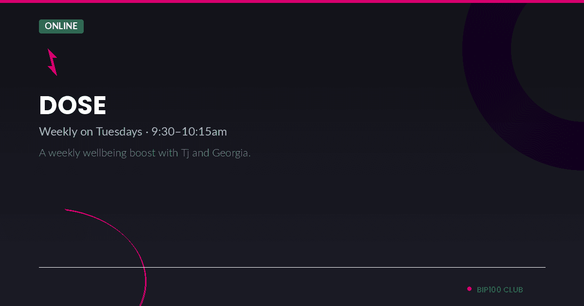 Get your weekly DOSE of dopamine, oxytocin, serotonin, and endorphins. Tj Power and Georgia Farrar host this energising Tuesday morning session designed to boost your mood, build connection, and set you up for a productive day.