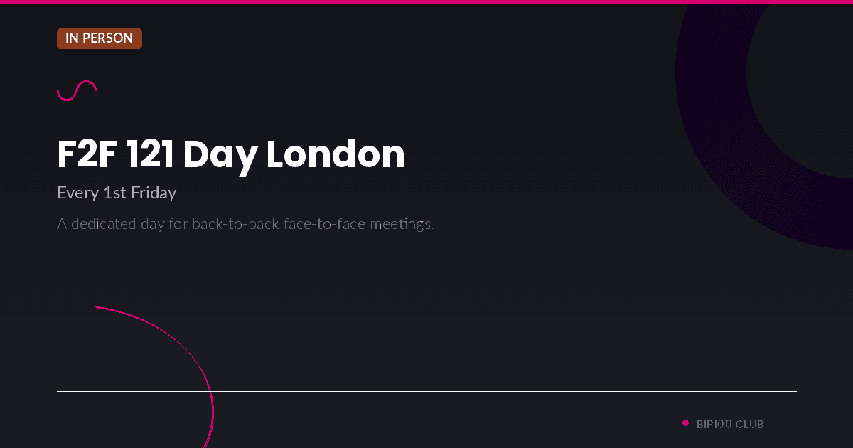 For one day a month, BIP100 members are invited to spend the day at our favourite lunch venue. Choose to purely co-work or pre-arrange 121 meetings with other 'BIPPers'. On average, over 80 in-person meetings are achieved on these days, a highly productive way to deepen relationships and find opportunities.