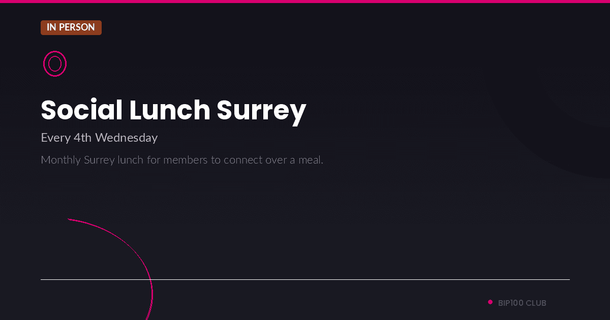The Surrey edition of our popular social lunches, held monthly. BIP100 members gather for a relaxed 3-course meal, building deeper connections and exploring business opportunities in a warm, supportive environment.